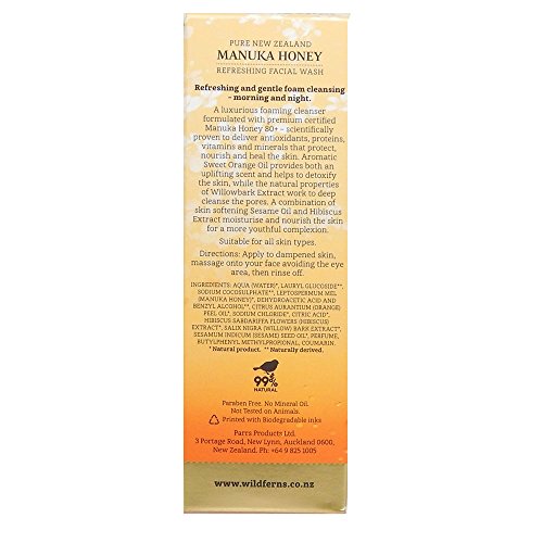 -. Binding : Health and Beauty -. Brand : Wild Ferns -. EAN : 0794866386858 -. Feature : Made with active antibacterial and antioxidant manuka honey / Made in New Zealand using pre unadutlerated Active Manuka Honey of the highest quality / Liquid forms a foam upon dispensing / 100ml/3.38oz / Cruelty free, paraben free, no mineral oil -. Label : Parrs Skin Care -. Manufacturer : Parrs Skin Care -. Model : 72344 -. MPN : 72344 -. PackageQuantity : 1 -. PartNumber : 72344 -. ProductGroup : Beauty -. ProductTypeName : BEAUTY -. Publisher : Parrs Skin Care -. Studio : Parrs Skin Care -. Title : Wild Ferns Manuka Honey Facial Wash, 100ml -. UPC : 794866386858