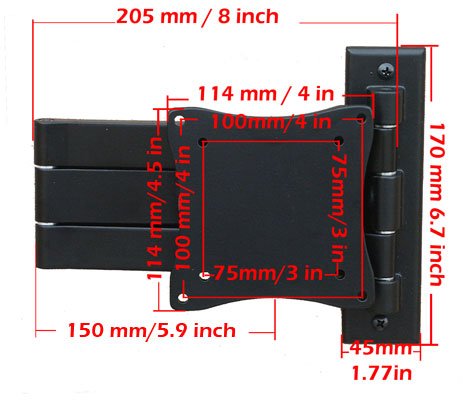 -. Feature : Holds Screen Size 15" 16" 17" 19" 20" 22" 24" 26" 27" and less than 33 lbs in weight / compatible with VESA 75x75(3"x3") or 100x100(4"x4") / 90 degress forward or backward tilt, 180 degress swivel / 14" long arm; fold 1.6" to save space / Common hardware and user manual included in the package