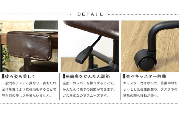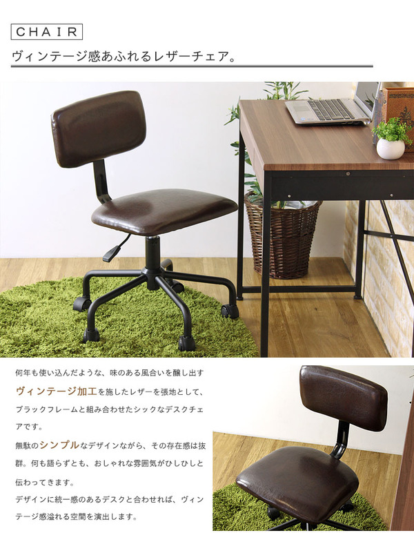 本商品はお取り寄せ商品のため、稀にご注文入れ違い等により欠品・遅延となる場合がございます。誠に恐れ入りますが、何卒ご了承ください。 また、以下の場合には追加送料がかかる場合がございます。  ・大型商品の複数購入時 ・同梱区分が異なる商品の複数購入時  【出荷目安】:1 - 5営業日 ※土日・祝除く 【同梱区分】:TS 2231 【梱包サイズ】:大型商品 【代引き決済】:不可  配送伝票の依頼主は出荷元(メーカーもしくは仕入元)名となる場合がございますので、お受け取りの際はご注意ください。   【型番】VINT-CHR  SOHOをおしゃれに、快適にサポートする、機能性とデザイン性に優れたシステムデスクシリーズ・リンツ。シンプルで使い勝手が良く、おしゃれなデザインであることにこだわりました。北欧、ヴィンテージ風なブラウン&ブラックのカラーリング。デスク、ワゴン、ラックと、省スペースでも収納力を兼ね備えたアイテムが勢ぞろい。レザーチェアを合わせれば、異素材が溶け合う様に調和した一体感のある空間を演出できます。お客様のお好みの組み合わせでお使いいただけるように、それぞれ単品でご購入いただけます。  ※こちらはチェア 単品 の商品ページです。  【サイズ】(本体)幅50×奥行50×高さ74-82cm(座面)幅42×奥行38×高さ44-52cm(背もたれ)横幅39.5×縦幅21cm  【材質】(座面、背もたれ)合成皮革、ウレタンフォーム(フレーム)スチール、塗装  【生産地】台湾  【商品仕様】 色:ダークブラウン(レザー)×ブラック  耐荷重:80kg キャスター付き 座面昇降機能付き(ガス圧式)   お客様組立品[組立の目安:約30分] ・座面下のレバーを操作して座面の高さが調節できます。 ・張地はバイキャスト加工により、アンティークな風合いを醸し出しています。  【ご注意事項】 ・本商品は、北海道・沖縄・離島への配送はいたしかねます。あらかじめご了承ください。 ・商品の組み立て開始前に部材不足、破損がないか必ずご確認ください。