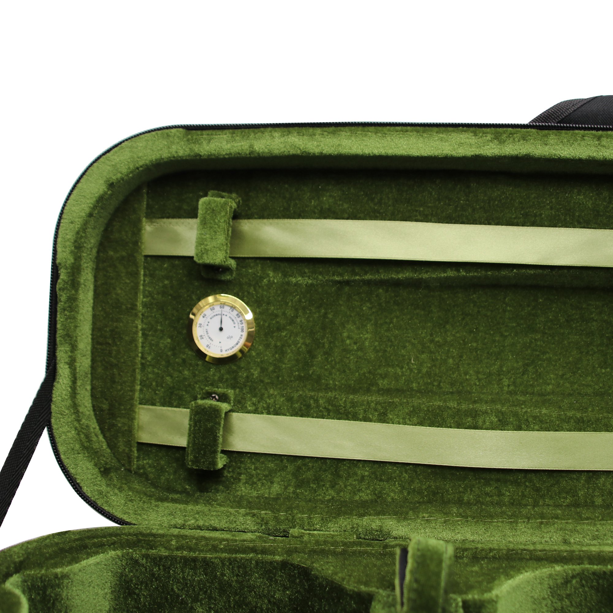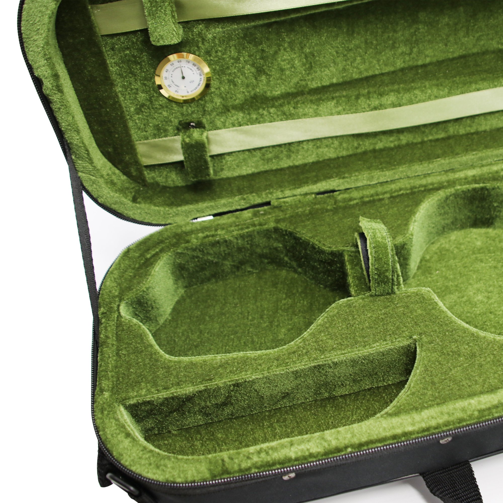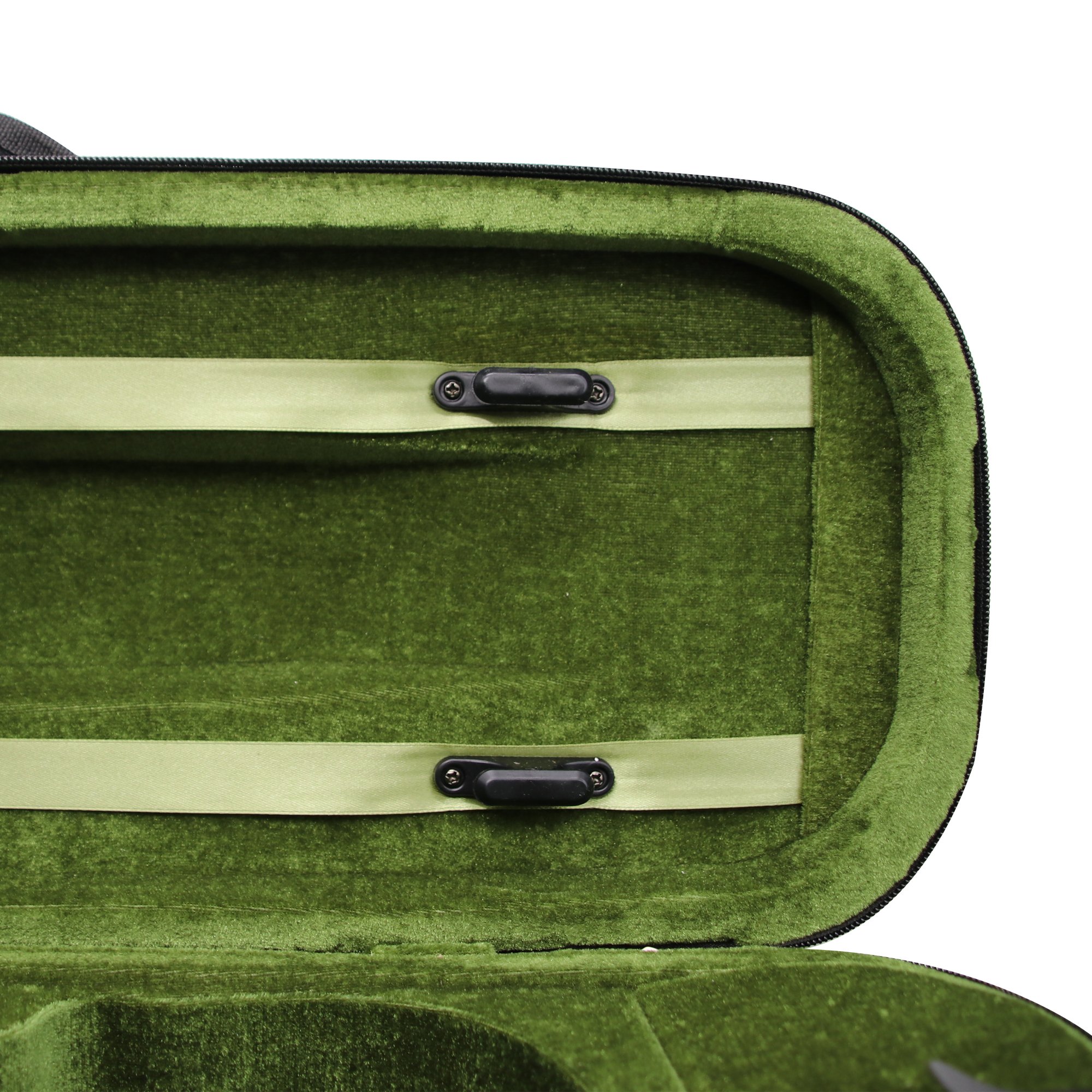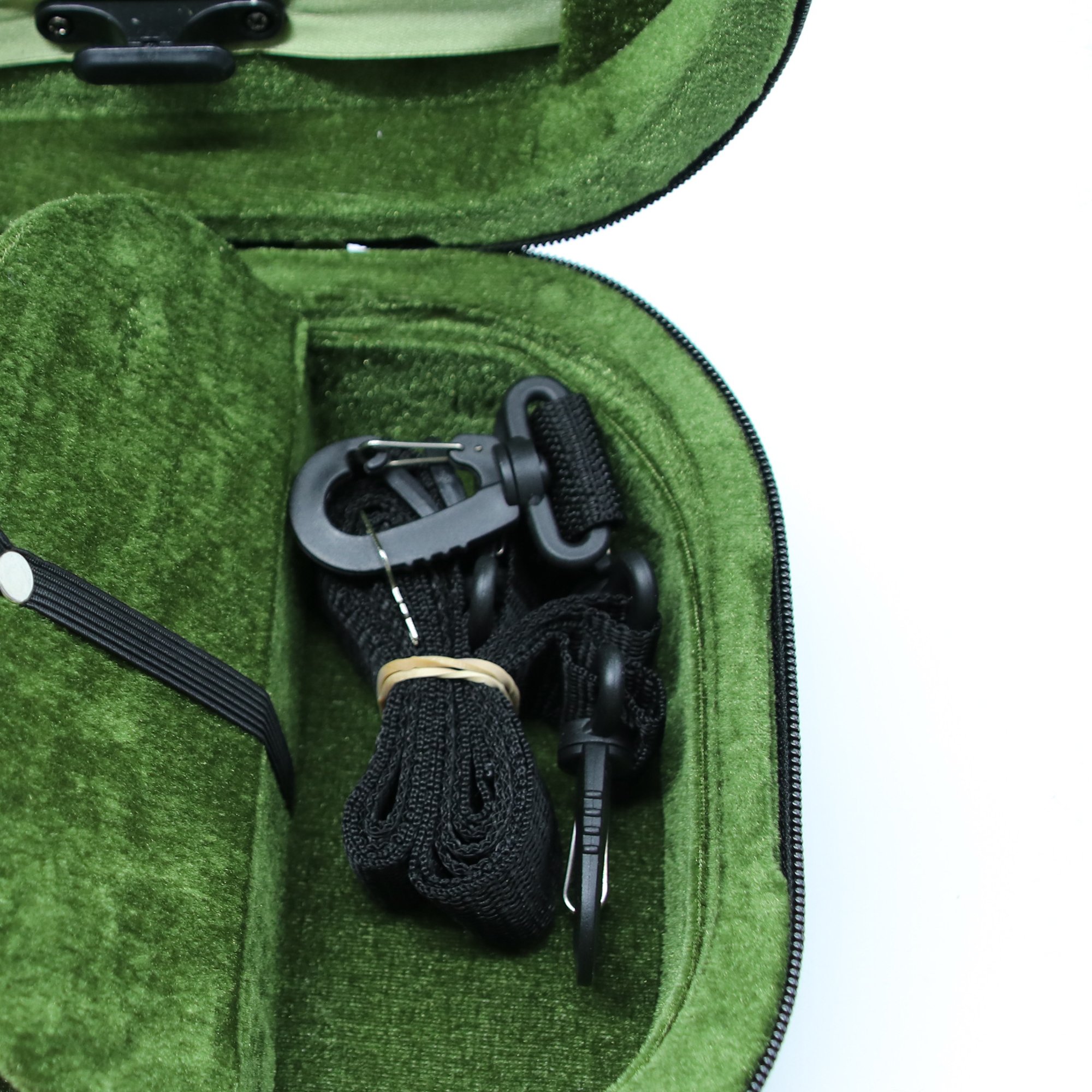 Pocket that opens and closes with zipper can store not only score, but also rosin, strap and bow etc