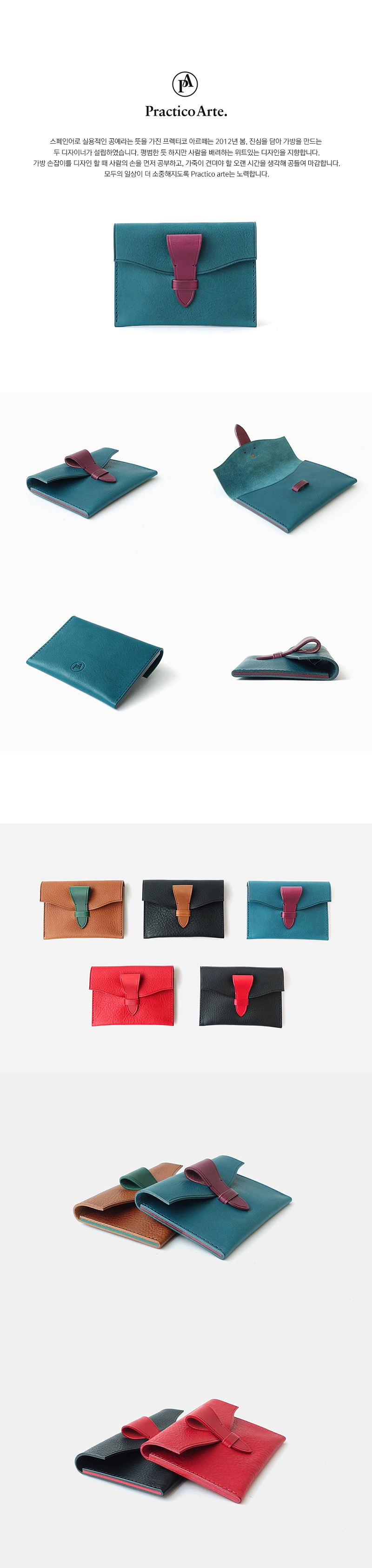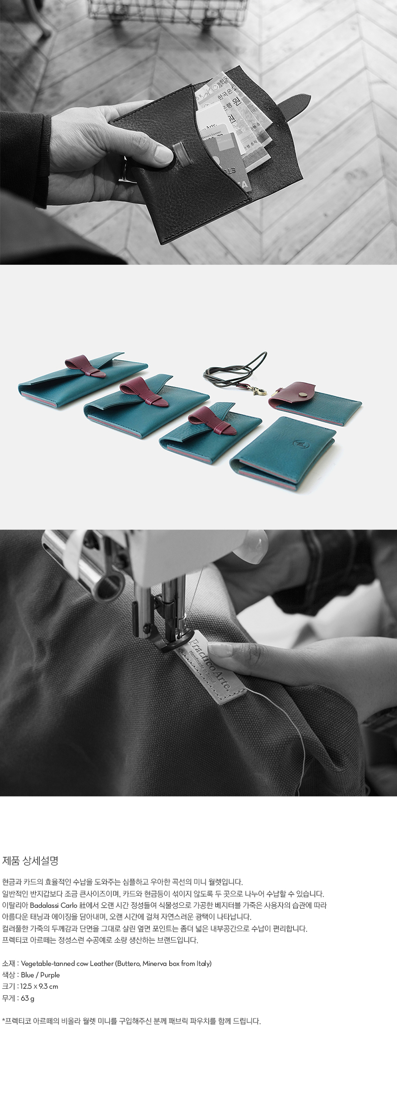 | 현금과 카드의 효율적인 수납을 도와주는 심플하고 우아한 곡선의 미니 월렛입니다. 일반적인 반지갑보다 조금 큰사이즈이며, 카드와 현금등이 섞이지 않도록 두 곳으로 나누어 수납할 수 있습니다. 이탈리아 Badalassi Carlo 社에서 오랜 시간 정성들여 식물성으로 가공한 베지터블 가죽은 사용자의 습관에 따라 아름다운 태닝과 에이징을 담아내며, 오랜 시간에 걸쳐 자연스러운 광택이 나타납니다. 컬러풀한 가죽의 두께감과 단면을 그대로 살린 옆면 포인트는 좀더 넓은 내부공간으로 수납이 편리합니다. 프렉티코 아르떼는 정성스런 수공예로 소량 생산하는 브랜드입니다. |