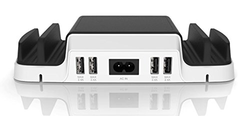 4 powered USB ports and extra 2 built-in micro cables shared 8 amps of power(total 40W), max 5v 2.4A for each port, can charge 6 devices at the same time.