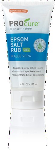Epsom salt rub PROcureTM Epsom Salt Rub + Aloe Vera spot treatment rubs on quickly, delivering a powerful blend of essential oils that target pain at the source for quick relief of muscle tension, stiffness and aches. Offers the same benefits as Epsom salt bath, but is portable and convenient. Non-greasy and fragrance-free. Made in USA. Set of two. 4 ozFeature
