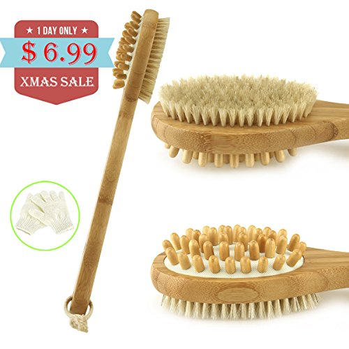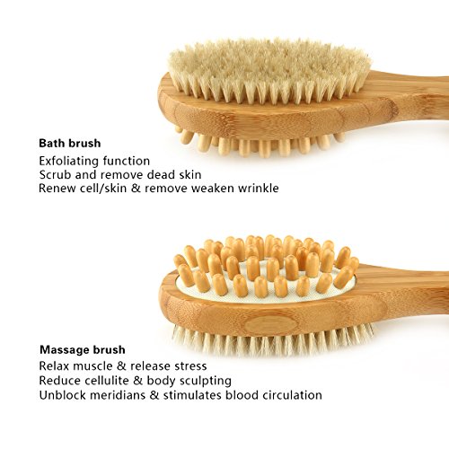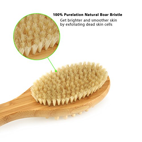 Two brushes in one back brush: Double sides two in one, made of highly and durable material and made from natural boar bristles which is great for wet or dry brushing and the massaging nub is excellent to use for treating cellulite, our brushes are 100% natural and hygienic, and you can safe for daily use, Use BOTH SIDES with your favorite soap or body wash to scrub and cleanse and remove dead skin in the tub or shower