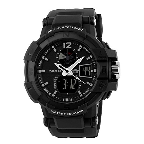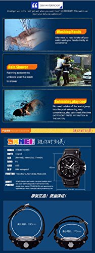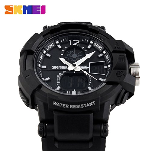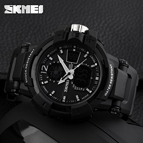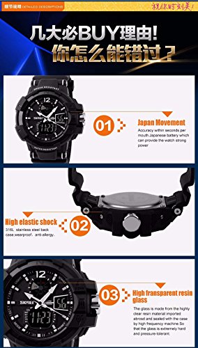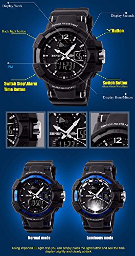 -. Feature : 164FT WATERPROOF: 164 ft waterproof (50 M) - 5ATM water resistant. NOTE: please DO NOT press any buttons in the water. / DUAL DIAL TWO TIMEZONE: analog and digital dual dial support two different timezone. Shock resistant, stop watch, military 12H/24H time, and LED back light functions make it perfect for all kind of sport and daily use. / COMFORT with FASHION: silicon rubber watch band with the large dual dial design make it comfortable to wear and lead you to edge sport fashion. Perfect for both indoor and outdoor activities. / MULTI-FUNCTIONAL: Dual Timezone, Calendar Day and Date, Alarm, Water Resistant, LED Display, Back Light, Shock Resistant, Stop Watch.