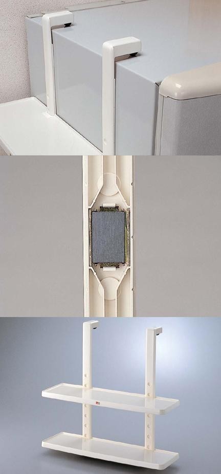 冷蔵庫サイドに引っかけるだけ(補助マグネット付)の冷蔵庫用サイドラックです。棚は2段とも高さ調節が可能で、1段あたりの耐荷重は2.5kgです。 |