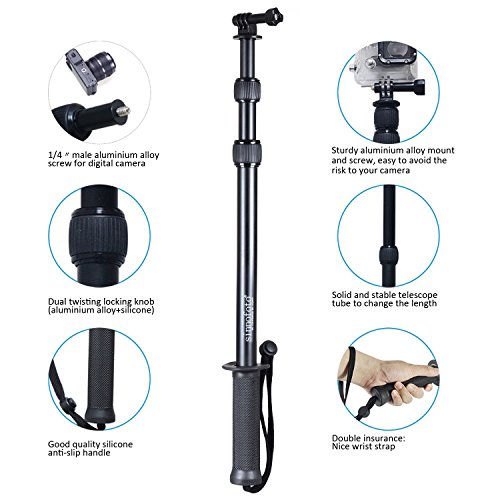 3.Variable temporary floating design. To avoid the risk to your camera, please keep Max extension when you in the water, it won’t sank immediately. User have time enough to take it back. Caution!!! Rotate 1/4 to 1/2 circle of the knob enough to extend , otherwise,it's pulled out.