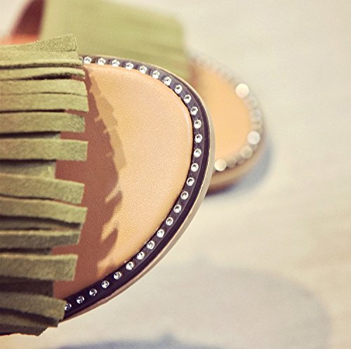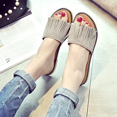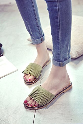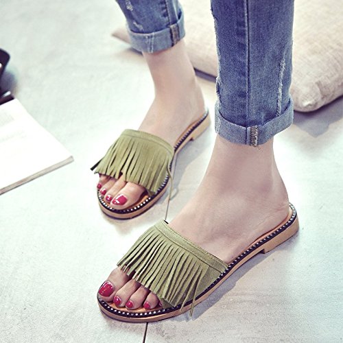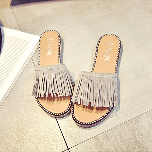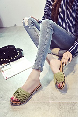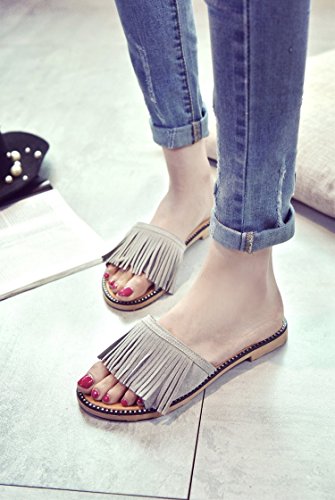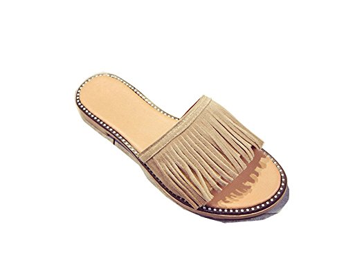 -. Title : (マイタンス)Myタンス 欧米 韓風 レディーズ フリンジ スリッパ ルームシューズ 滑り止め 無地 総 タッセル ビーチサンダル ヌバックレザー フラットシューズ 3色