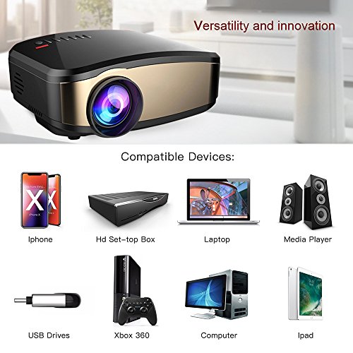 ► Support AV/VGA/USB/HDMI slots and wireless Miracast/Airplay connection, which makes it possible to connect Laptop, Tablet, DVD, XBOX, Smartphones to this projector.