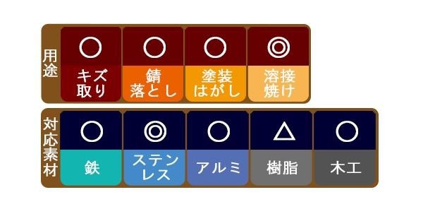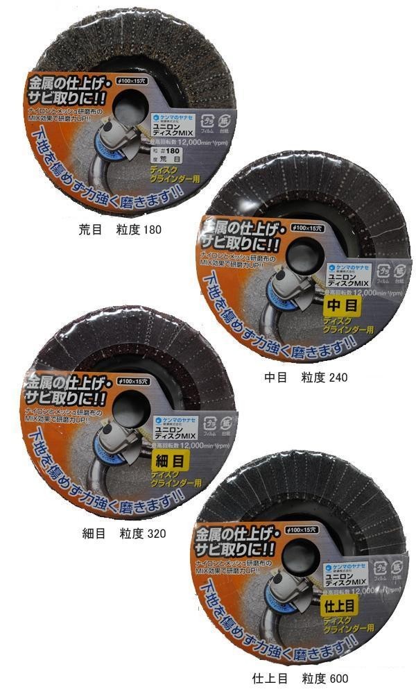| 仕様 | 【粒度】 荒目180、中目240、細目320、仕上目600 【その他仕様】 最高回転数:12000min-1(rpm) 適用機種:Φ100グラインダー MIXタイプ |