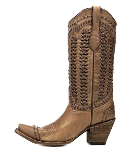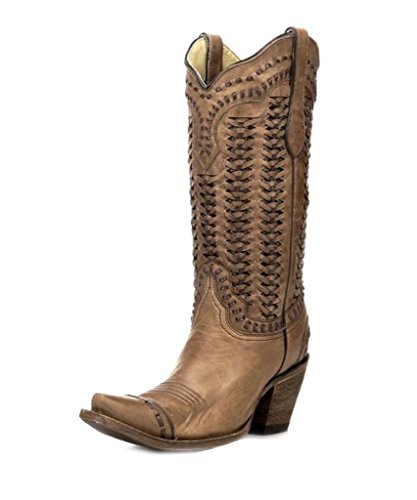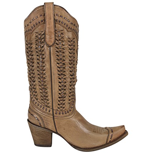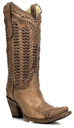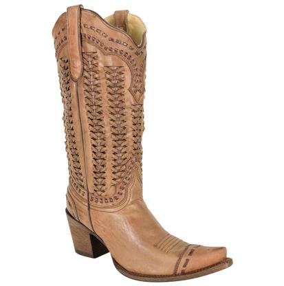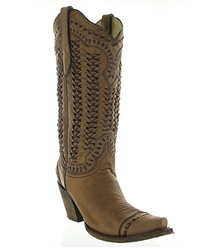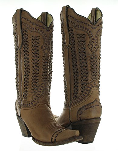 Studio : Corral Boots Publisher : Corral Boots Binding : Apparel Product Description Be a stylishly dressed cowgirl by completing your outfit wearing these uniquely-designed women's boots. Handcrafted in leather, these boots stand out in fashionable flair with braided details covering the shafts and collars, and also over the toes and heels. Soft linings and cushioned insoles provide comfort for longer wear. Dip openings and pull tabs help in making dressing easier. Snip toes, leather outsoles and high heels bring some true Western flavor. Complementary to most outfits in any season, these are fabulous must haves! Shaft height: 13'. Shaft leather: Cowhide. Toe type: Snip toe. Heel height: 3'. Goodyear Welt Construction. 0