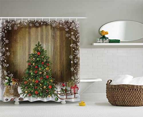 Christmas Tree Shower Curtain Christmas decoration Vintage Watercolor Print Waterproof Mildew Resistant fabric Christmas gift holiday decoration 72 x 72 Inch