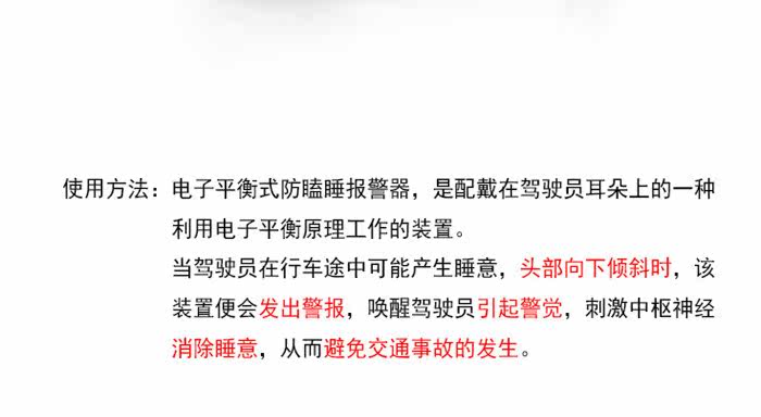 【Instructions】: electronic balance drowsiness alarm, wear on the driver's ear on the use of a balance of electronic work principle of the device. When the driver may be drowning on the way and the head is tilted down, the device will alert you to wake up the driver and alert the central nervous system to eliminate sleepiness, thus avoiding traffic accidents.