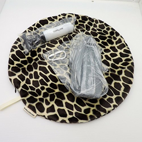 -. Feature : Supillow - Your Ultimate Travel & Support Air Pillow. / Cushions the body with air for support that can be customized to fit your personal needs. / Relieves pressure points, encourages movement and better posture. / GIves the ability to stretch and change positions when sitting for hours.. / Includes soft pillow cover in brown giraffe P.R.Int, air pump, air pillow insert, elastic strap, and satchel clip.