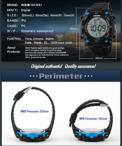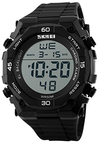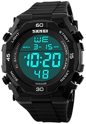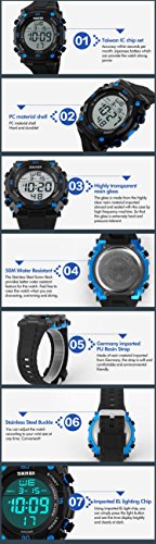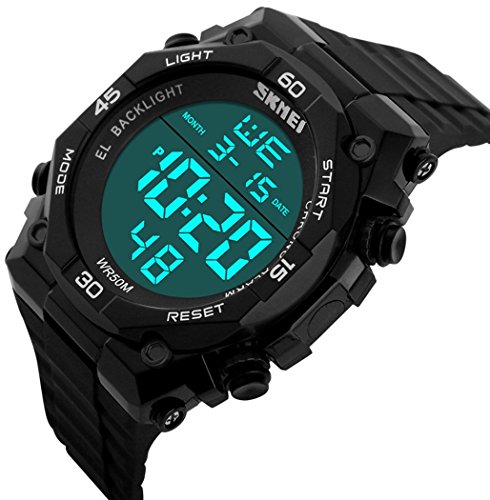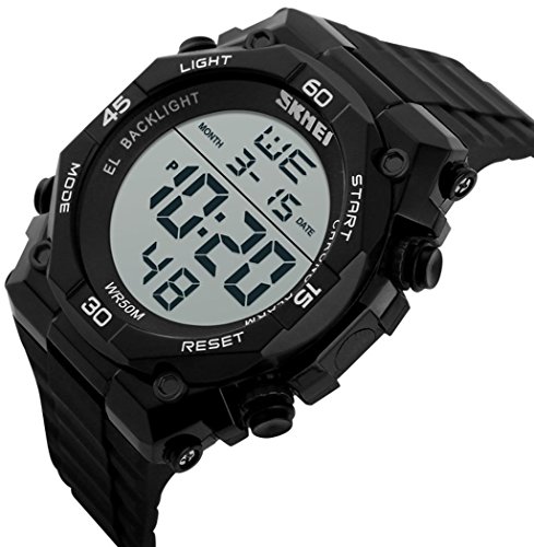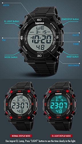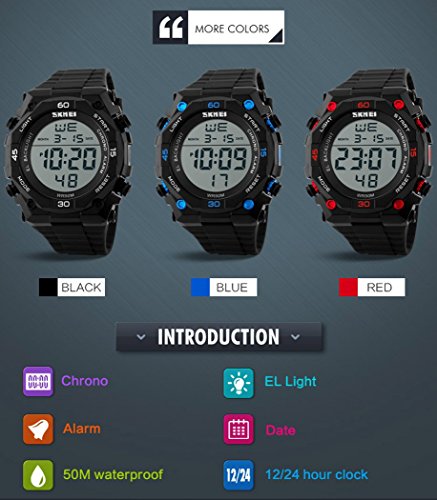 -. Feature : Digital watch: Fashionable sporty dial design, military style outlook. / Mens watch:Appeals to mens, especially to those who like doing sports. / Focuses on designing and manufacturing wristwatch of young people. / Multifunction Watch:Auto Date,Alarm,Water Resistant,LED display,Shock Resistant,Stop Watch, Back Light / Charming for all occasions. Amazing looking watch, a great gift for your relatives and friends.