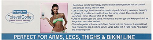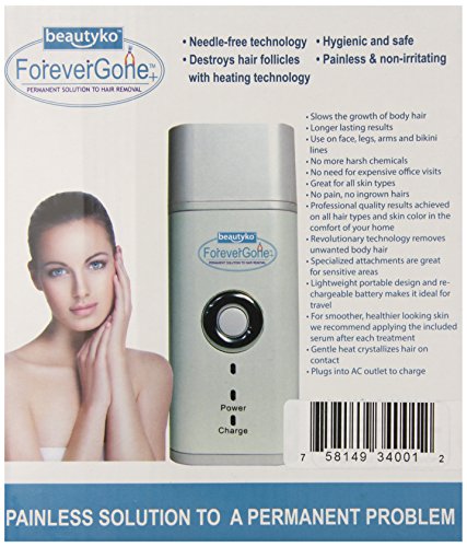 Eliminating the need for harsh chemicals or expensive treatments, The Sivan Forever Gone smooth skin bladeless hair removal system is a painless and easy way to effectively way to remove all hair types. Professional quality results at a fraction of the price and in the comfort of your own home, or even while traveling with it's compact and easy to carry size. Each order includes: The Sivan Forever Gone smooth skin bladeless hair removal system, large and small heat transferring tips, soothing serum, large buffer with 4 refill pads, AC adapter and a cleaning brush. Suitable for all skin and body types.