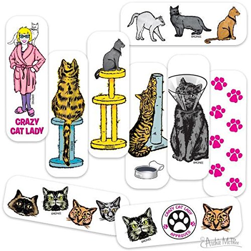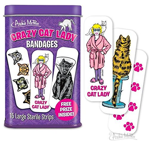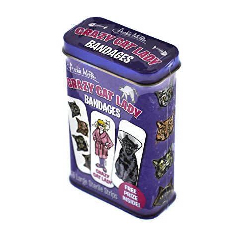 Studio : MTS Publisher : MTS Binding : Misc. Product Description Cat owners know that sometimes, accidentally, kitties can give you tiny little scratches or bite marks. These Crazy Cat Lady Bandages not only cover them up, but advertise how much you love your cats with an assortment of fantastic feline imagery. There are 15 large sterile strips, 3" x 1" (76mm x 25mm), that come in a 3-3/4" (9.5 cm) tall metal tin. FREE PRIZE! Latex-free adhesive. Twelve shrink wrapped tins in each illustrated display box. 0