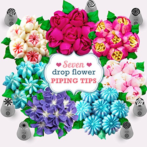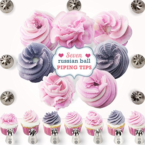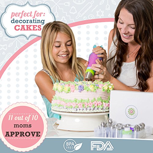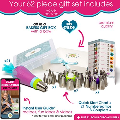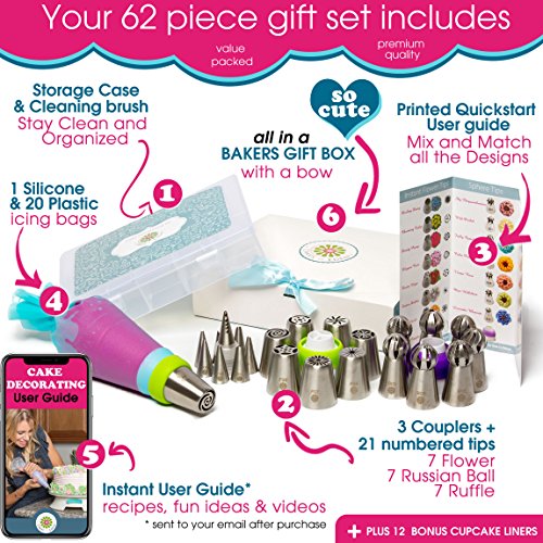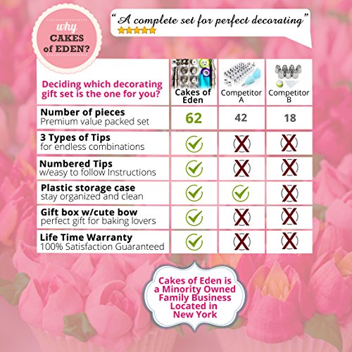 ? EVERYONE WILL ASK: "WOW, DID YOU REALLY MAKE THOSE? " YES I DID! Your frosted masterpieces will bring smiles to everyone's faces by saving the party from boring desserts! Everyone will want to know your secret! ? MOM APPROVED Get your kids off the couch and screens to join you in the kitchen for a weekend filled with laughs, delicious treats and everlasting memories. And be at ease knowing all the tips are the highest quality FDA Approved 304 stainless steel and BPY Free pastry bags. Your children deserve only the best. Cakes of Eden is a brand caring moms can trust. ? THIS VALUE PACKED PREMIUM SET COMES WITH EVERYTHING YOU NEED FOR DECORATING MASTERPIECES: 7 X Russian Piping Tips - Drop flowers for instant bouquets 7 x Sphere Ball Tips - Create dazzling large petaled flowers and stunning swirls with ease 7 x Ruffle Tips - Ideal for elaborate patterns yet so fast and easy to use ( Wilton Compatible ) 1 x Leaf Tip - Quickly detail and accent your flowers 3 x Couplers - Making it super easy to switch nozzles and colors 1 x Silicone Icing Bag - Reusable and perfect for stiff icing 20 x Plastic Disposable Icings Bags 1 x Cleaning brush 1 x Plastic Storage case - Stay Organize 1 x Printed Quickstart User guide - See the pattern for each Numbered nozzle. Plus the perfect recipe for stiff buttercream 1 x Gift Box - No need for wrapping paper. Comes in an cute gift box and bow (FREEBIE #1) 12 x BONUS CUPCAKE LINERS - Add an extra flare with these elegant cupcake holders (FREEBIE #2) PLUS BONUS GIFT - An instant eBook jam packed with instructional videos, step by step illustrations, Pro Tips/Hacks and 25 mouth watering recipes ? 0 |