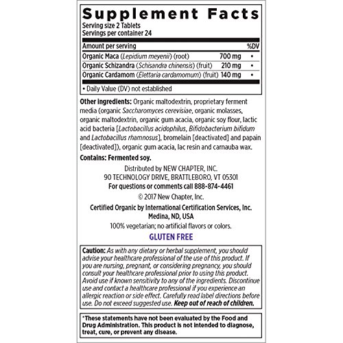Energize with the adaptogenic power of Maca root. NEW Fermented Maca Tablets help you get the most from this outstanding superfood from Peru. New Chapter's premium quality, Non-GMO, USDA organic Maca supplement supports energy, endurance, stamina, and workout recovery. Following our principles of acknowledging both science and tradition, our Maca is uniquely fermented so it's easily digestible, and blended with complementary Schizandra and Cardamom.