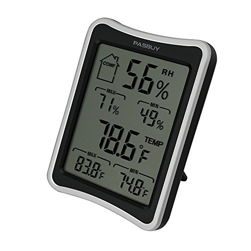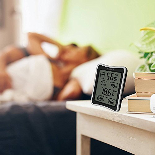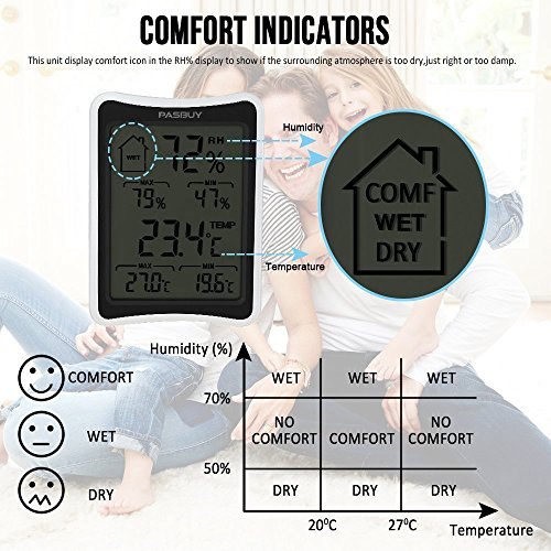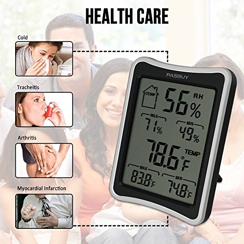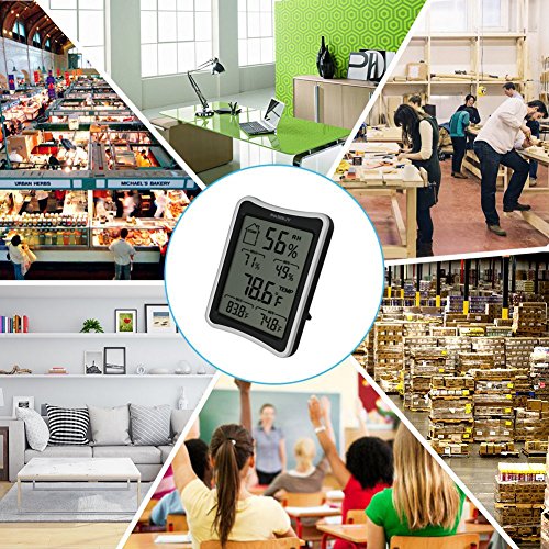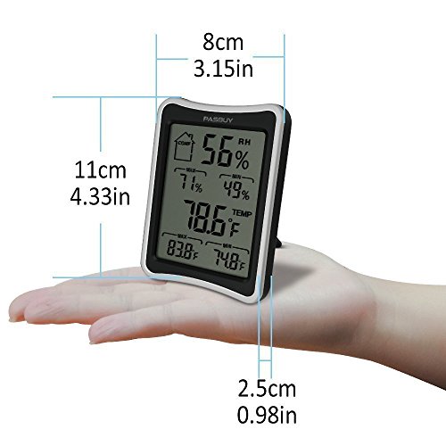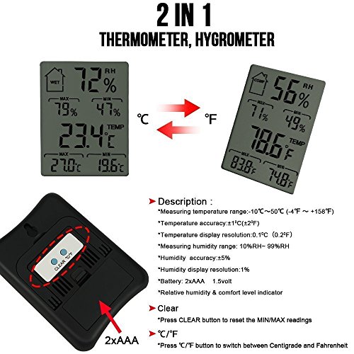 We need it: This product makes it possible for us to know about and control the real-time surrounding environment's temperature and humidity. It is of great help for our health to know about the real-time surrounding environment conditions. We can prevent colds, mold, bacteria and other viruses from threatening our health. The real-time understanding of temperature and humidity conditions also help us a lot in work. For example, we can prevent the warehouse humidity from too high in advance, protecting the warehouse articles from mildew. In general, this product is simple, practical, convenient, price cheap, wide usage. It will be a great assistant of your work and life. Operational Guidelines: 1. Press the "Clear" button to reset the minimum / maximum reading . 2. Press the "° C / ° F" button to switch between Celsius and Fahrenheit. 3. This unit display comfort icon in the RH% display to show if the surrounding atmosphere is too dry, just right or too damp. Notes: 1, Replace the battery when the display dims, using 2 x AAA batteries. 2, Instrument performance may be affected if operated within a high frequency radio field, such as near a mobile phone, or if subjected to an electrostatic shock. 3, The product is not waterproof. Specifications: Measuring temperature range: -10℃~50℃ (-4℉ ~ 158℉). Temperature accuracy: /-1℃( /-2℉). Temperature display resolution: 0.1℃(0.2℉). Measuring humidity range: 10%RH~ 99%RH. Humidity accuracy: ±5%. Humidity display resolution. 1% Battery: 2 x AAA 1.5volt. Package includes: 1 x Humidity Monitor Thermometer Monitor (Battery NOT Included) 1 x User Manual. 0
