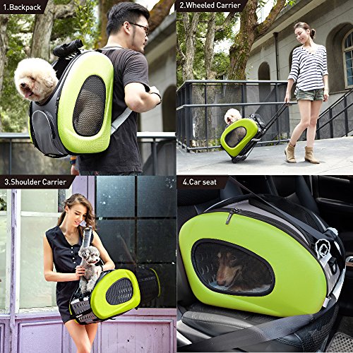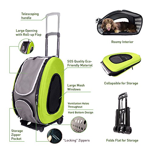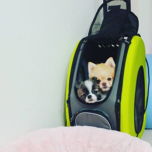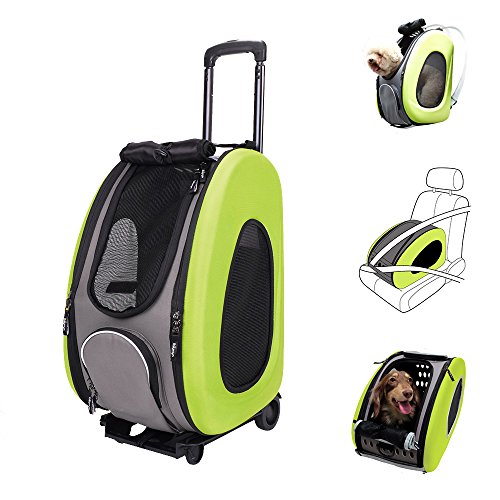 Studio : ibiyaya Publisher : ibiyaya Binding : Misc. Product Description IBIYAYA's Signature Multi-Function Carrier of all time. One item fulfills all your needs; you only need to buy this one and forget the rest.?? Multi-function 5 in 1 Package, could be used as; ?1. Shoulder carrier, ? 2. Backpack, ? 3. Pet Carrier Stroller, ?4. Pet car seat,? 5. Carrier with wheels. Whereas 4 in 1 Package, could be used as; 1. Shoulder carrier, ?2. Backpack, ?3. Pet car seat,? 4. Carrier with wheels. ??The EVA material has passed stress-crack test, which means the material does not crack. It has also passed SGS quality test, you can be sure that it does not have the chemical odor smell. This carrier will offer your fur baby a cozy motorhome.?? ◆ Multifunction? ◆ Space saving design, easy storage and transportation.? ◆ Eco Friendly material (EVA)? ◆ "Locking zippers" to prevent accidental escapes.? ◆ Carrier has one large side zipper pocket.? ◆ 360 degree swivel front wheels?and rear safety brakes.? ◆ Pet Stroller comes with One-Hand-Fold mechanism? ◆ Pet Stroller comes with Snack Tray with Dual Cup Holders.? ◆ Patented Product.?? Recommended Weight Limit: 18 lbs? N.W.: Carrier 4 lbs / Folding Cart 2.6lbs / Stroller frame 9lbs ?Carriage Dimensions: L20 W12 H13.5 (in)? Stroller Dimensions: L36 W37.4 H19 (in)? Stroller After Fold Dimensions: L19 W12 H32 (in)? Accessories: Removable pad with diaper sheet attach function design/ Shoulder Strap / Safety tether X1?? This carrier is NOT designed for airline use. Please do not choose your carrier based on weight - please reference your pet's length and height to make sure the size fits.?