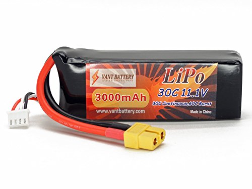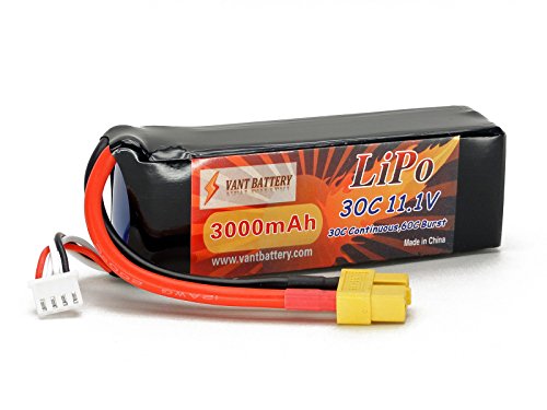 Features: True Capacity and C-Rating Thick 12AWG Discharge Leads XT60 Discharge Plug JST-XH Balance connector Capacity: 3000mAh Voltage: 3S / 3 Cell / 11.1v Discharge Rate: 30C Constant (90A) / 60C Burst (10 sec) (180A) Charge Rate: 2C (6.0A) Watt Hours: 33.30Wh Weight: 6.7oz / 190g (including wire plug) Dimensions LxWxH: 100.1 x 34.6 x 26.2 mm Dimensions w/ Wires folded at end of pack: 103.3 x 34.6 x 26.2 mm *Note that dimensions may vary by ± ~1mm. Discharge Plug: XT60 Connector Balance Plug: JST-XH Includes: 11.1V 3000mAh 3S Cell 30C-60C LiPo Battery Pack w/ XT60 Connector Vant Battery Warranty w/ Lifetime Replacement Plan Equipment Needed: LiPo Balance charger capable of charging 3 cell LiPo batteries Equipment Recommended: LiPo Safe Charging Bag/Sack/Pouch, Cell Voltage Reader, Extended Battery Strap if required by your vehicle. Safety Notes Warnings: LiPo batteries are potentially hazardous. Improper usage can cause fire or explosion. Charge and Store battery in LiPo-Safe Bag away from flammables on a concrete surface. Charge using a LiPo compatible Balance Charger ONLY! Never Charge above 4.2V per cell. Never Discharge below 3.2V per cell. Always use under adult supervision. The end-user is fully responsible for any results in using this battery pack. 0 |