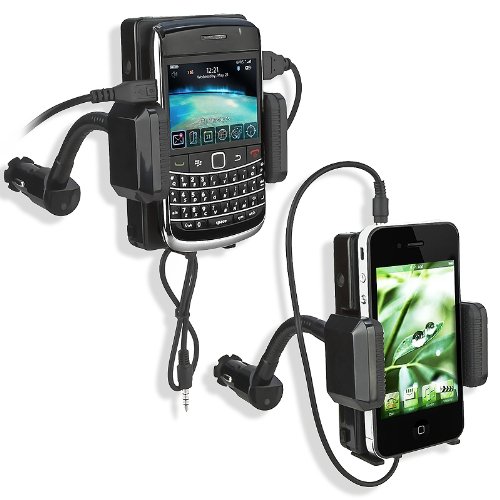 - Feature : Broadcast music from your iPod , PDA, MP3 or CD player, and even portable DVD player with this All-in-One FM transmitter. / Features: Suitable for all MP3 players, such as iPhone / iPod / Zen / Creative Zen on all cars. / Plugs directly into cigarette lighter for power. Flexible goose-neck pipe for easy, comfortable positioning. / Adjustable holder keeps music player devices within reach. Type A USB socket for charging mobile phone, GPS, and other devices. / Compatible With Apple: iPhone 5