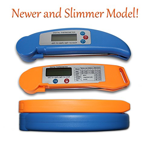 - New slimmer and environmentally friendly digital thermometer with Larger Display and Longer Probe makes it convenient to obtain accurate temperatures for meat, chicken, fish, and liquids - probe can be easily cleaned and folded for safety