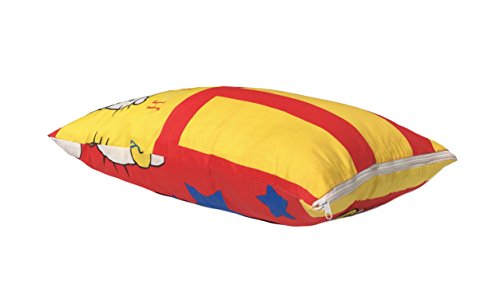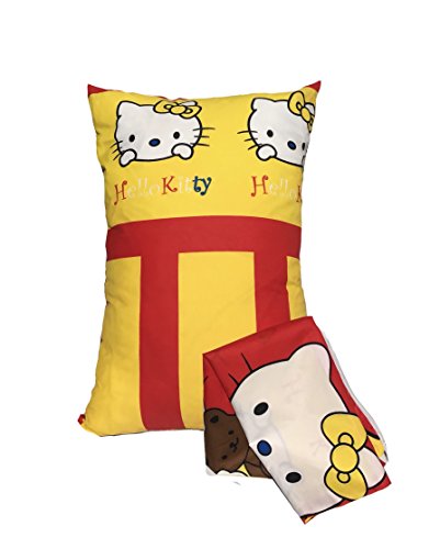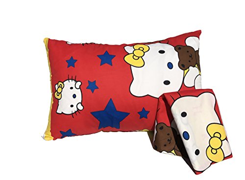 2-Piece Set Colorful "KIDS" Pillowcase. Fits STANDARD / QUEEN Size pillow. Made of 100% Soft Cotton. Size: (approx.)18"Length x 24" Wide. Double-side of decorative design. Front: Hello Kitty with yellow ribbon bow, blue stars with solid red as background. Back: Hello Kitty face, red stripes in yellow background.