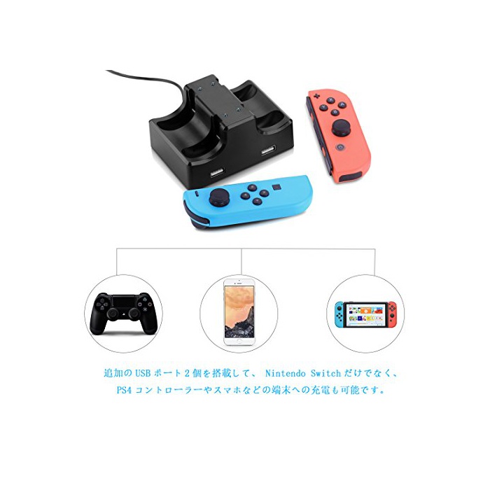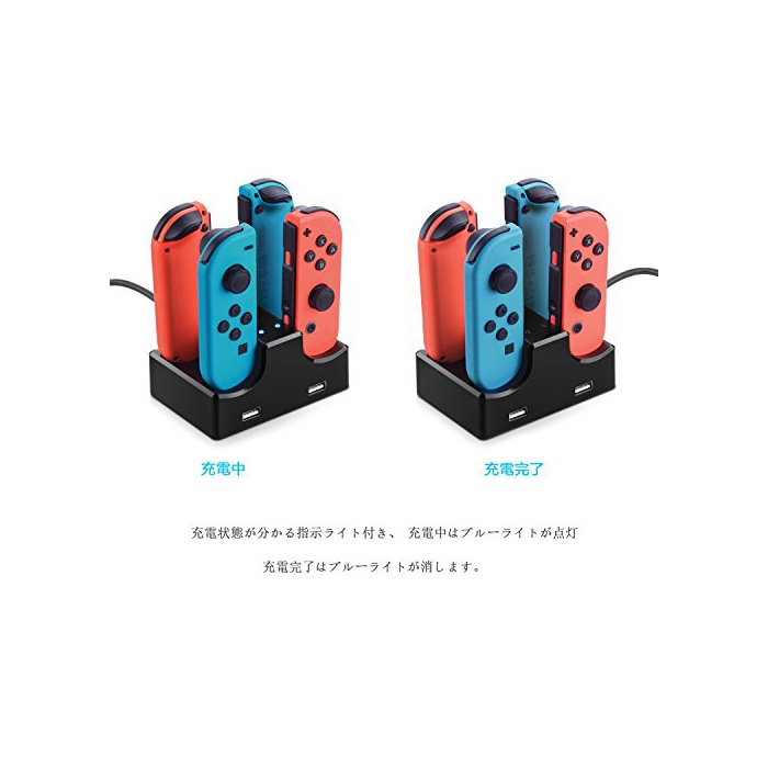 Joy-Con본체 대응 충전 차저(Charger)입니다.동시에4 개충전 할 수 있고, 콤팩트에 수납 성과,방을 깨끗이와 정리 정돈하는 일이 가능합니다.(4대 동시 충전하기위해,출력 파워가 1.5A이상이 필요하게 된다)