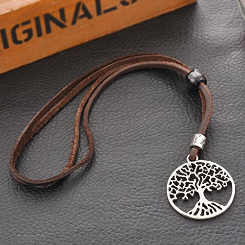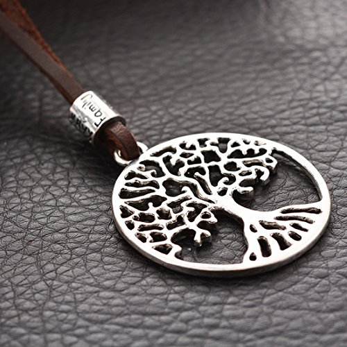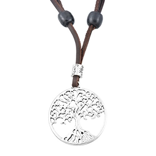 MJARTORIA Damen Lebensbaum Kette Leder Halskette Hohl Rund Scheibe Baum Anhanger Lederkette Braun Altsilber Farbe