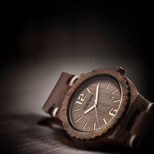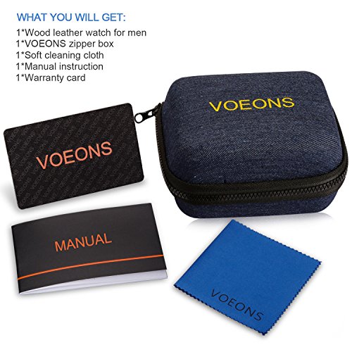 ACCURATE TIME KEEPING with DATE:Japanese MIYOTA movement, 2-year-life battery offer you accurate time in long time, date displays between 4 and 5 in this VOEONS wood leather watch