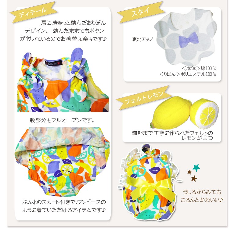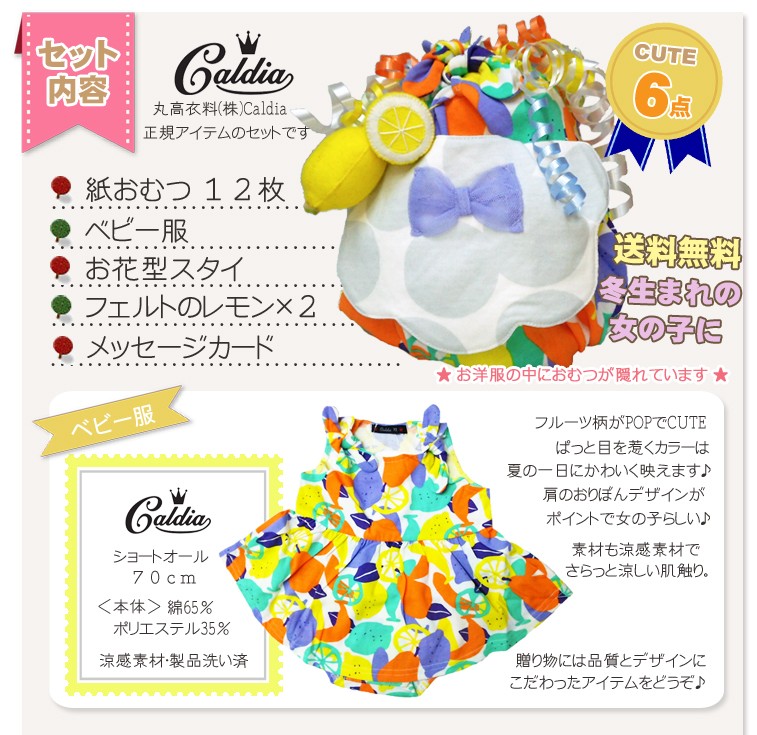 フルーツ柄がCUTEなショートオールとお花型のかわいいスタイをおむつケーキに仕立てました。前も後ろもころんとかわいくデコレーション。標準的な赤ちゃんが半年前後に着ていただける70cmサイズです。冬生まれの女の子向けの出産祝いにぴったりです。ベビー服の中にはおむつが隠れています。 当店だけのベビー服のおむつケーキは記憶に残るギフトになるはず・・・<使用するおむつ> パンパース(テープタイプ)12枚 S,Mから選択できます。<付属品> ・Caldia ショートオール 70cm ・Caldia スタイ ・フェルトのおもちゃ×2 ・メッセージカード<のし、メッセージカード> 無料でお付けできます。(のしかカードかどちらかとなります) メッセージ内容は当店が用意しました定型メッセージと自由な文面をお選びいただけます。 ※60文字程度までが収まりがいいです。<ご持参用手提げ袋> ご持参に便利な手提げ袋をお付けできます。 ※ご注文者様ご自宅へのお届けに限らせていただきます。 <おむつケーキの本体サイズ> 直径18cm×高さ20cm出産祝い おむつケーキ ベビー服 冬生まれ 女の子