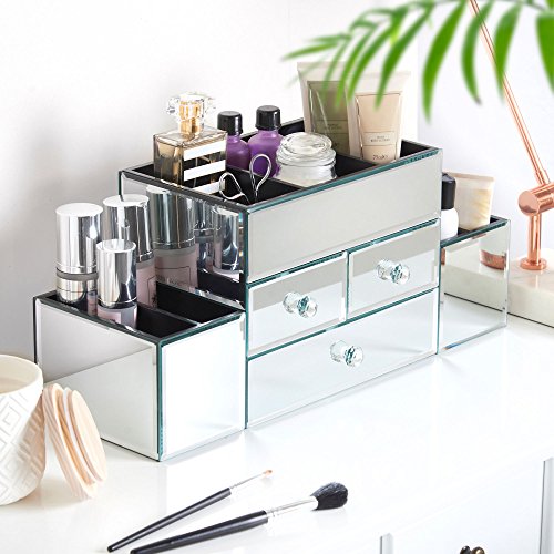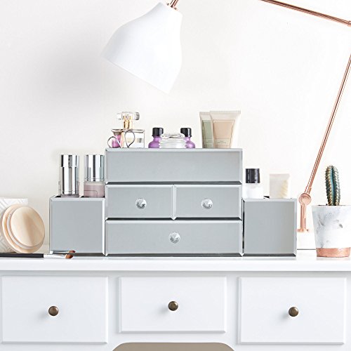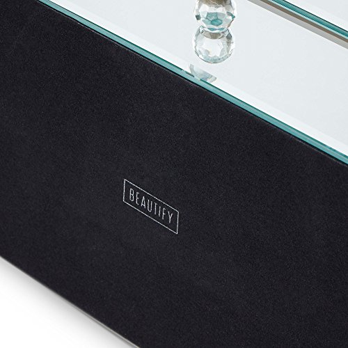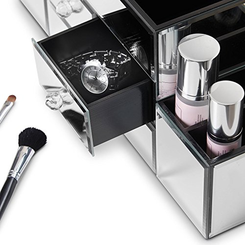 Add an elegant touch to your vanity table with the Beautify Mirrored Organizer. Practical and extremely stylish to boot, the organizer will make a welcome addition to any bedroom or dressing room. Perfect for all your essentials and more - earrings, necklaces, rings, bracelets, hair accessories, makeup, makeup brushes, hair and skincare products, fragrance bottles, toiletries; the list goes on. Features a robust frame with three spacious drawers complemented by delicate crystallized handles. Offering up even more storage space is a large top section with five individual compartments plus two extended sections on either side. Stunning mirrored glass sides ensure this organizer makes a real impact wherever you place it. Comes complete with a soft glass cleaning cloth to keep the box looking perfectly polished. Ideal for home use as well as beauty parlors. Fantastic gift idea for all jewelry and makeup lovers. Full size: (L) 18 x (W) 6.3 x (H) 8 inches Please note: accessories shown are for illustration purposes only and are not included. 0 |