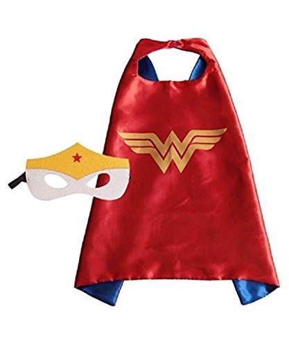 Wonder Woman superhero cape and mask set with velcro closure and double sided satin. Measures approximately 70cm x 70 cm. Great for dressing up, pretend play, parties and more!