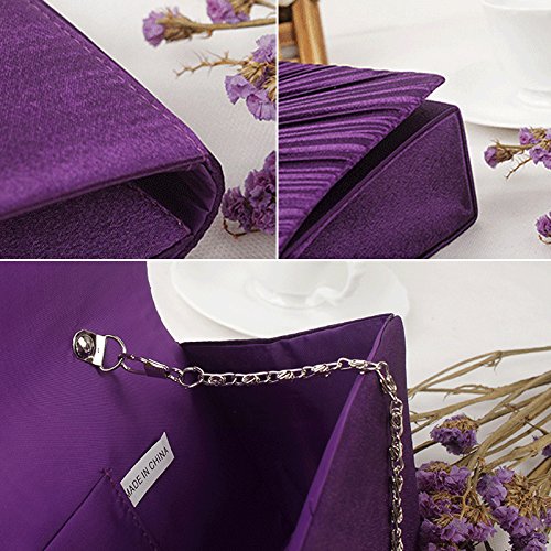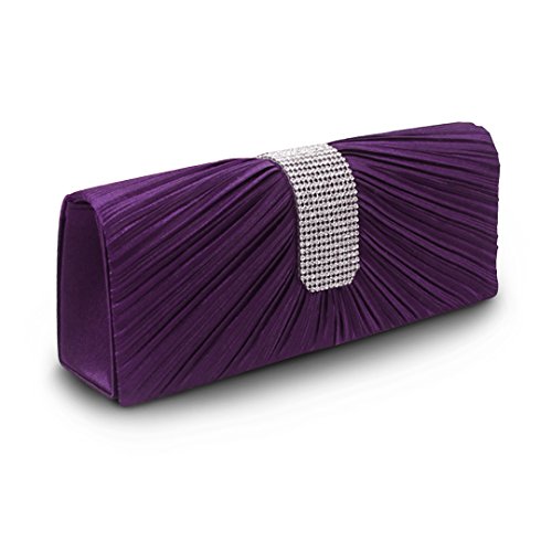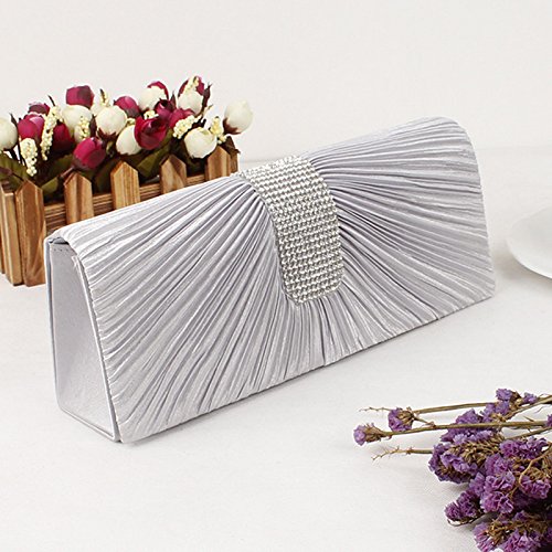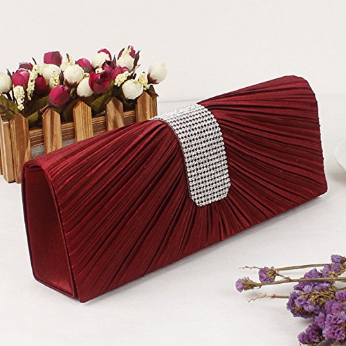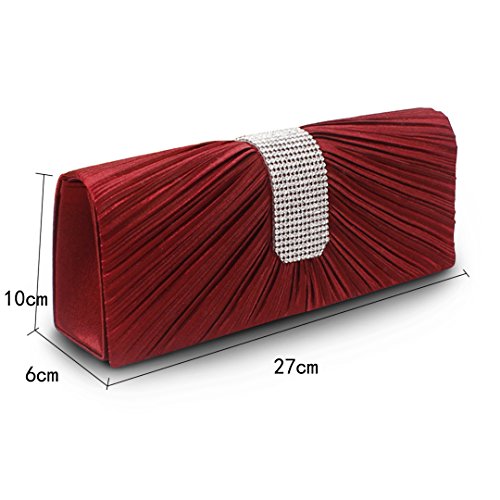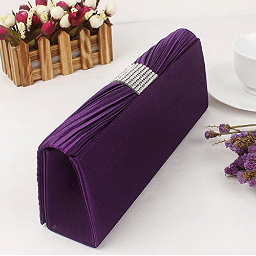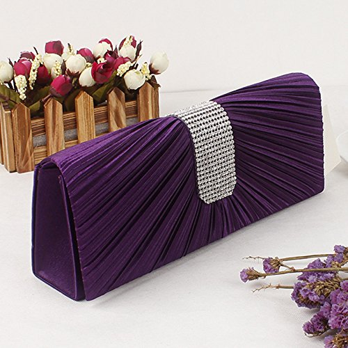 Fabric material: Rhinestone and satin. Style: Fashion. Type: Clutch. Popular element: Pleated. Processing method: Paint. The internal structure: Zipper pocket, certificate pocket. Applicable targets: Women. Function: Clutch, Sling bag. Color: Silver, Red, Purple, Black. Product size: 10.7 * 2.4 * 3.9in. Packing Included: 1 * Clutch.