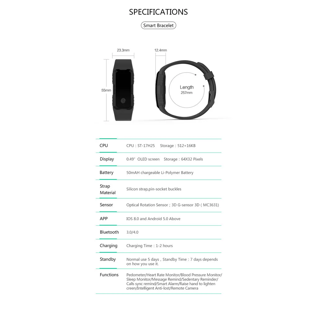 Function:Permanent Calendar,Week,Dial Call,Alarm Clock,Passometer,24 hour instruction,World Time,Call Reminder,Sleep Tracker,Calendar,Heart Rate Tracker