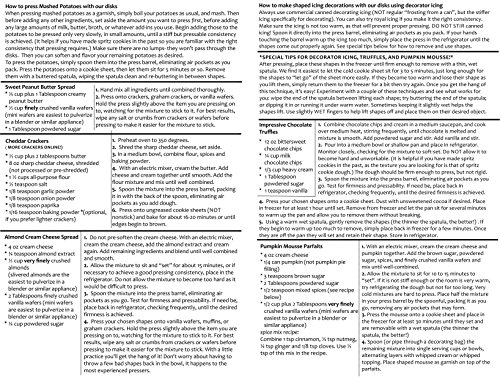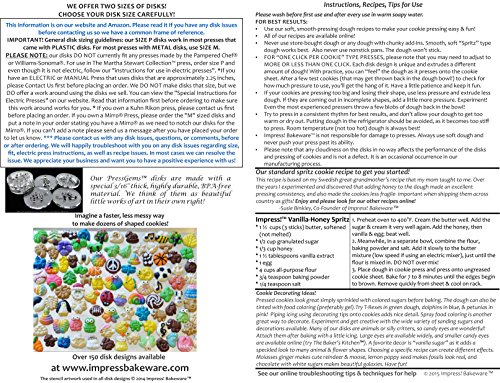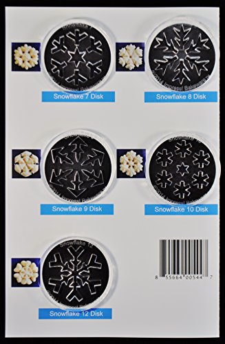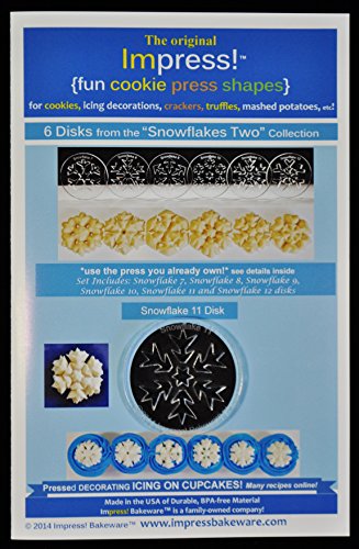 - Feature : Cookie press disks in 6 fun designs: Snowflake 7, Snowflake 8, Snowflake 9, Snowflake 10, Snowflake 11, Snowflake 12 / Make Snowflake shaped cookies & crackers, icing decors, dessert spreads, truffles & mashed potatoes. We also have Recipes: Spritz Cookie + 7 other cracker, icing, dessert spreads, truffle & mashed potato. / Made with a special 3/16" thick, highly durable, BPA-free material; USA made; family-owned company / SIZE M disks work in most presses that came with METAL disks. For presses with PLASTIC disks, see similar product in SIZE P. / ***Please read this information if you have any disk issues before contacting us so we have a common frame of reference. **IMPORTANT! PLEASE NOTE these exceptions: *Our disks DO NOT currently fit any presses made by The Pampered Chef®, Williams-Sonoma®, or KitchenAid®. *For the older Wilton® Cookie ProTM Ultra (from the early 2000's) w/Metal Disks (Manual) use size P disks even though it comes with metal disks. *For the Avon® Cookie Press Kit use size M disks even though it comes with plastic disks. *For the Food Network 12-Piece Cookie Press please order the "P" sized disks and send us a message to use a thinner white material. *If you own a Kuhn Rikon® press, please CONTACT US before ordering. *If you own a Mirro® Press, please order the "M" sized disks and put a note in your order stating you have a Mirro® as we need to notch the disks. For ANY of these issues, if you can't add a note please send us a message after you have placed your order to let us know. *For use in The Martha Stewart CollectionTM press, order size P and even though it is not electric, follow our "instructions for use in electric presses". *If you have an ELECTRIC or MANUAL Press that uses disks that are approximately 2.25 inches, please CONTACT US first before placing an order. We DO NOT make disks that size, but we DO offer a work around using the disks we sell. You can view the "Special Instructions for Electric Presses" on our website. Read that information first before ordering to make sure this work around works for you. *Please contact us with any disk issues, questions, or comments, before or after ordering. We will happily troubleshoot with you on any disk issues regarding size, fit, electric press instructions, as well as recipe issues. In most cases we can resolve the issue. We appreciate your business and want you to have a positive experience with us!*