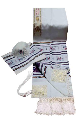 Binding : Apparel Product Description This tallit features symbols of Jewish Festivals woven in jacquard design of fine quality dacron and wool blend. Motifs include menorahs, challahs, candlesticks, Megillah scroll and more. Beautiful fringes complement the tallit. Tallit comes with a matching kippah in a zippered tallit bag, standard white tzitzis strings tied onto all 4 corners. Made in Israel. Tallit sizes are approximate. 0
