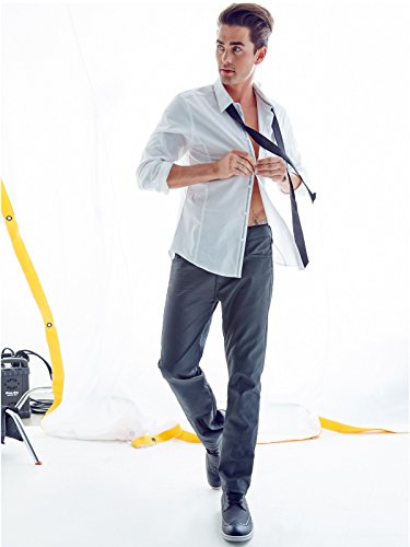 -. Feature : Medium rise, sits at hips. Slim fit with straight leg. / Coated finish. Five-pocket construction. Zip fly with button closure. / 10" front rise. 14.5" back rise. / 16" leg opening. Inseams available: 30", 32". Measured on a size 32. / 71% cotton, 28% polyester, 1% spandex