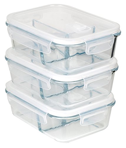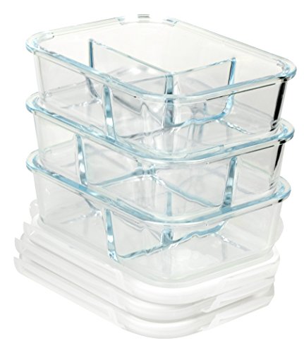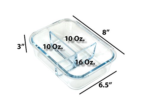 PERFECT SIZE & BEST VALUE – 6 Piece Set 3 Three Compartment glass food storage containers and 3 vented snap locking lids, we guarantee we have the best quality products at the best price. 3- 36 Oz (4.5 Cups), 8” x 6.5” x 3” main compartment 2 Cups and small compartments 1.25 cups each, easy for meal prepping, saves space, and travels easily
