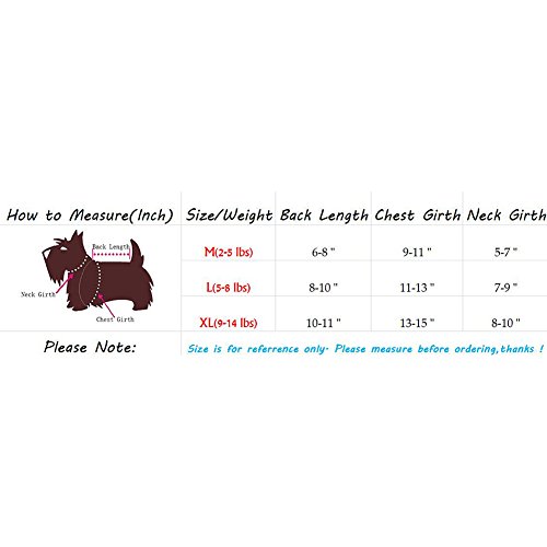 -. Feature : Brand Name: Fenarzo ; Any unauthorized sales under this brand will be pursued for legal responsibility / Please Note: the size is designed for small pets and runs very small,please choose one size up if necessary,thank you / Size M(Back Length: 6-8 inch, Chest Girth: 9-11 inch, Neck Girth: 5-7 inch,fits for 2 - 5 pounds) / Size L(Back Length: 8-10 inch, Chest Girth: 11-13 inch, Neck Girth: 7-9 inch,fits for 5 - 8 pounds) / Size XL(Back Length: 10-11 inch, Chest Girth: 13-15 inch, Neck Girth: 8-10 inch,fits for 9 -14 pounds)