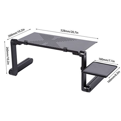 The adjustable laptop desk size:20.7 x 10.2 x 10.2 inches.Weight approx: 3.6pounds and can support up to 25 pounds capacity.