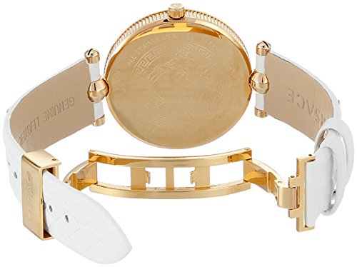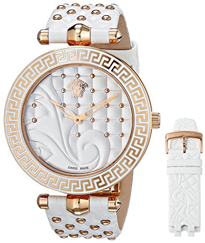 -. Binding : Watch -. Brand : VERSACE -. Department : womens -. EAN : 3430040613019 -. Feature : Ronda 762.3 Swiss quartz movement / Rose gold ion plated coated stainless steel case and buckle / Ivory dial with baroque pattern in relief / White quilted leather strap with small studs; additional strap with baroque pattern in relief- 27 mm / Water resistant to 99 feet (30 M): withstands rain and splashes of water, but not showering or submersion -. Label : VERSACE -. Manufacturer : VERSACE -. Model : VK7010013 -. MPN : VK7010013 -. PackageQuantity : 1 -. PartNumber : VK7010013 -. ProductGroup : Watch -. ProductTypeName : WATCH -. Publisher : VERSACE -. ReleaseDate : 2013-09-27 -. Studio : VERSACE -. Title : VERSACE Women's Vanitas Rose Gold Ion-Plated Coated Stainless Steel Interchangeable Straps Watch Set