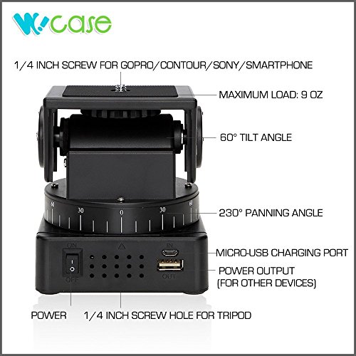 CAUTIONS: 1. Do NOT rotate/twist pan tilt manually. Always use remote. 2. Maximum mounting weight: 260 gram (9oz). 3. Do not disassemble unit. 4. Turn OFF both pan tilt and remote when not in use to avoid power drainage. (Warranty will be voided if user violates any of the cautions terms.) Items included: motorized pan-tilt remote control, tripod mount adapter, smartphone clamp mount adapter, micro USB charging cable. Camera and tripod shown in the images are NOT included. The most versatile rotating pan tilt- 1. 230 degree panning angle and 60 degree tilt angle for super wide coverage. 2. 15-20 meters (45-60 ft.) outdoor remote control range for capturing footage in various condition. 3. Charge your device while in use, allowing for a longer usage time. Compatible with GoPro HERO cameras, smartphones (Apple iPhone 6/6 plus/5s/5/4s/4 Samsung Galaxy/Note Series) and many other brands: SONY AS100 AS200 AS20 AZ1 X1000/CONTOUR ROAM3 +2/HTC RE (All mounting accessories are included). Can be mounted onto any ?¡± tripod. NOT compatible with heavy DSLR due to weight limit. DO NOT mount overweight (>260gram) devices. Pan tilt and remote are NOT water proof. Extended usage time-Charge and provide additional power supply your GoPro or other mounted device (Smartphone/action cam) when using theFeature