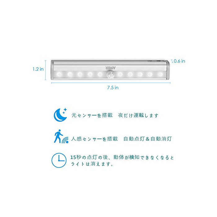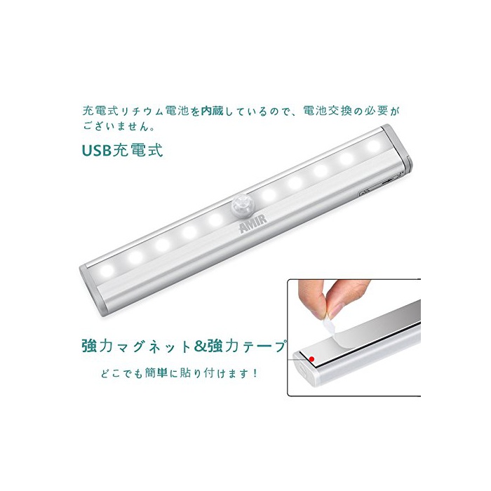 원본상품명: AMIR キッチンライト LEDセンサライト USB充電式 人感センサ ライト 10個LED電球 高輝度 省エネ 超命 ワイヤレス マグネット付き 階段 クロゼット 玄に最適