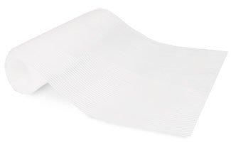 -. Feature : Clear modern polymer material won't deteriorate or tear / 12" x 25' / Polished low friction surface for easy movement of china, glassware, pots and pans / Sealed surface locks out most stains, cleans with mild detergent / Not dishwasher safe