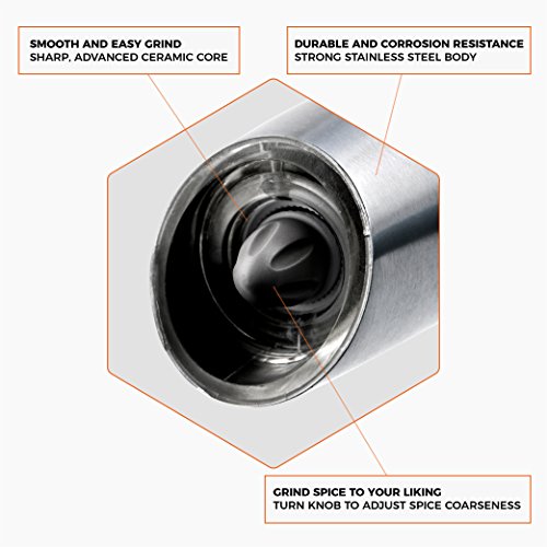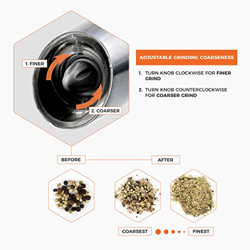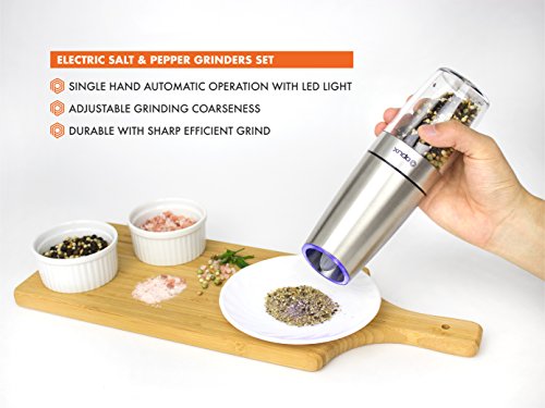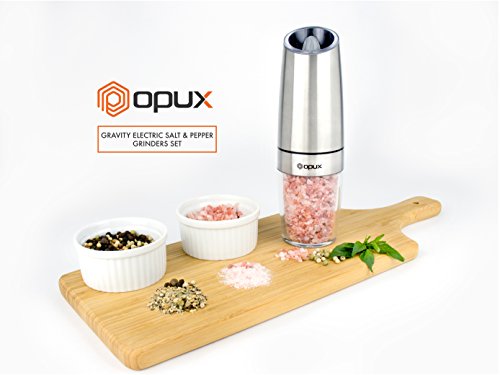 Studio : OPUX Publisher : OPUX Product Description Premium Electric Gravity Style Salt and Pepper Grinder Set by OPUX ? This Premium Electric Gravity style salt and pepper grinder set by OPUX is perfect to use while cooking inside your kitchen or grilling outside in your backyard! ? This Premium Electric salt and pepper grinder set by OPUX is durable with a sharp, efficient grind. ? An instruction manual is included with this electric salt and pepper grinder set by OPUX. This Premium Electric Gravity Style Salt and Pepper Set requires 6 AAA batteries (not included). ? Our Premium Electric Salt and Pepper Grinder Sets measure at 7.5" tall, 2.5" wide. OPUX creates quality products for your many lifestyles. Our Vision To provide premium kitchen and wine products that greatly simplifies your life. We will continue to innovate and bring exciting products to market so you can achieve more in life! Our Products At OPUX, we offer an extensive line of kitchen tools (such as salt pepper mills), lunch bags, and wine bags/accessories made of highest quality for all occasions. Our products are meticulously designed with materials and functions that truly simplify your life so you can focus on creating your favorite meals or entertaining your guests. 0