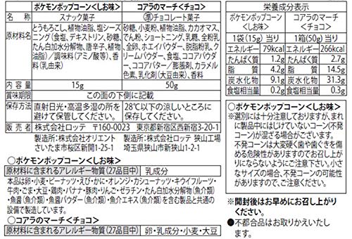 原材料:【ポケモンポップコーン<しお味>】とうもろこし、植物油脂、塩シーズニング(食塩、デキストリン、砂糖、たん白加水分解物、唐辛子、植物油脂)/調味料(アミノ酸等)、香料(乳由来)【コアラのマーチ<チョコ>】砂糖、小麦粉、植物油脂、カカオマス、でん粉、ショートニング、乳糖、全粉乳、全卵、ホエイパウダー、脱脂粉乳、クリームパウダー、食塩、ココアパウダー、ココアバター/膨脹剤、カラメル色素、乳化剤(大豆由来)、香料