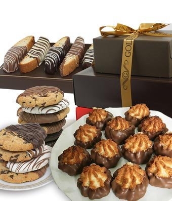 -. Feature : Includes: 12 Belgian Chocolate Dipped Gourment Chocolate Chip Cookies + 12 Belgian Chocolate Dipped Biscotti + 12 Belgian Chocolate Dipped Macaroons / Arrives in an elegant gift tower. / TO INCLUDE A GIFT CARD MESSAGE: Check the box labeled "This is a gift" in your cart or at checkout. / One business day for processing. Overnight shipping to ensure freshness. No deliveries on Saturday, Sunday or Monday.